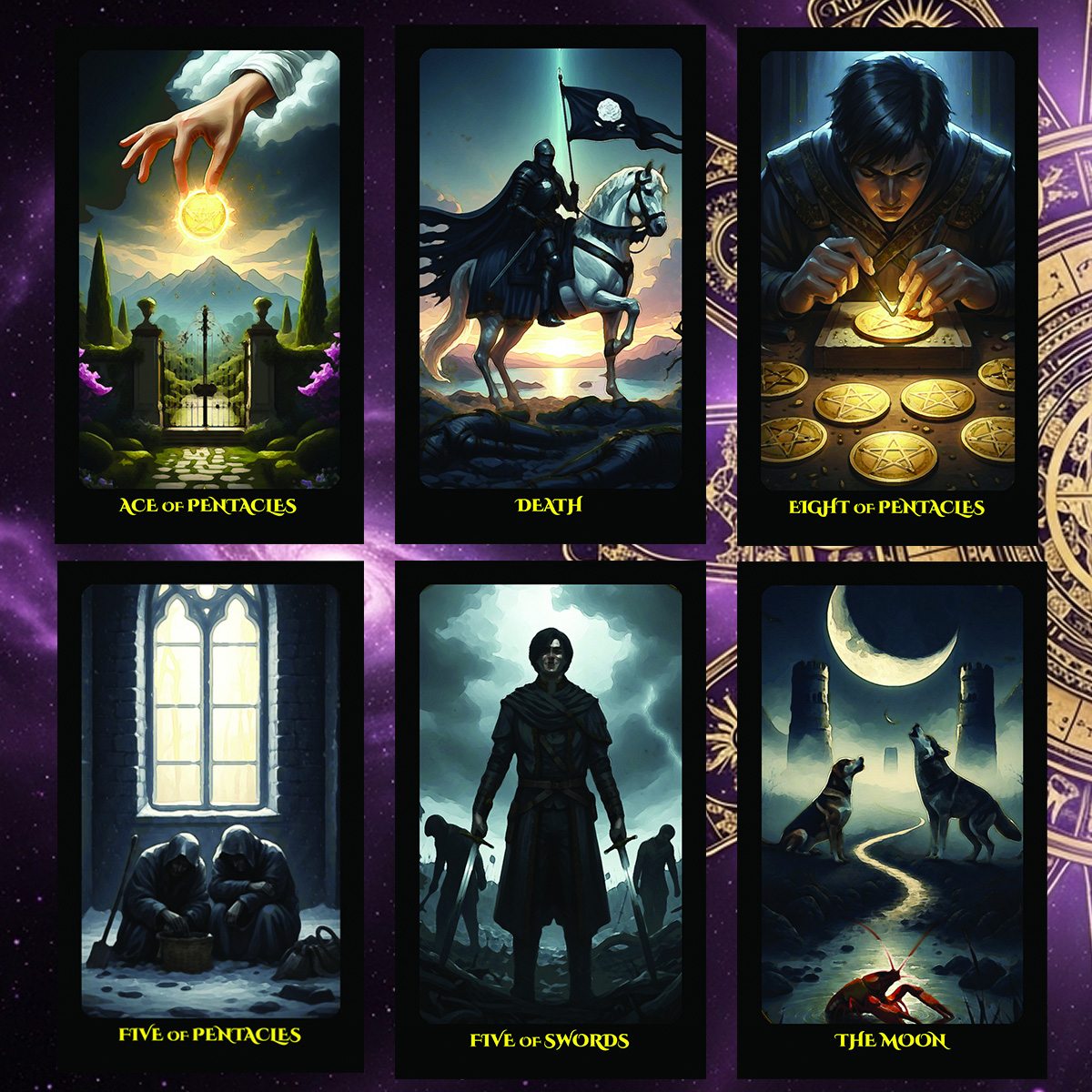Black & Gold was born from weeks and weeks of intense exploration into AI-assisted art creation. Hundreds of hours were spent learning prompt engineering, refining outputs, and editing imagery to faithfully represent the rich symbology tarot readers have come to know and love. Every card has been tuned for visual harmony, emotional impact, and readability in spreads. The skills honed creating this set have become the foundation for later, even more ambitious decks — but this one remains such an important part of our discovery and passion for this new form of art.